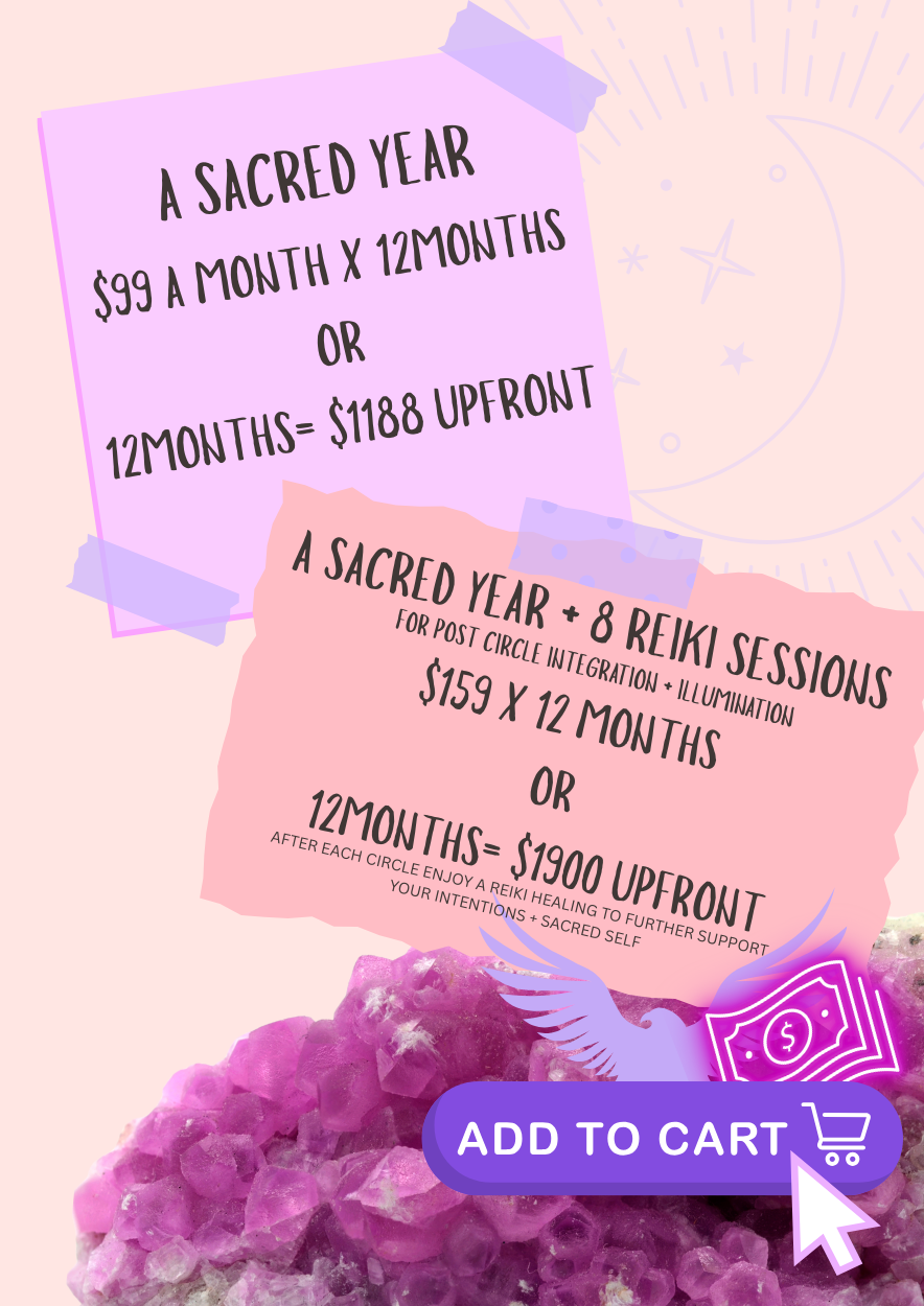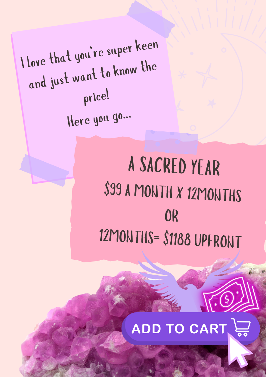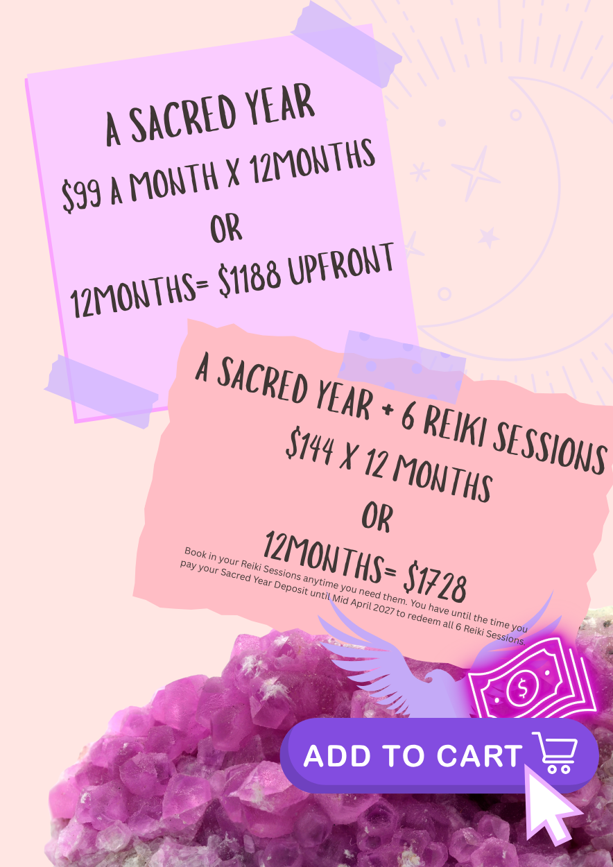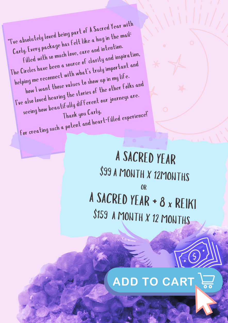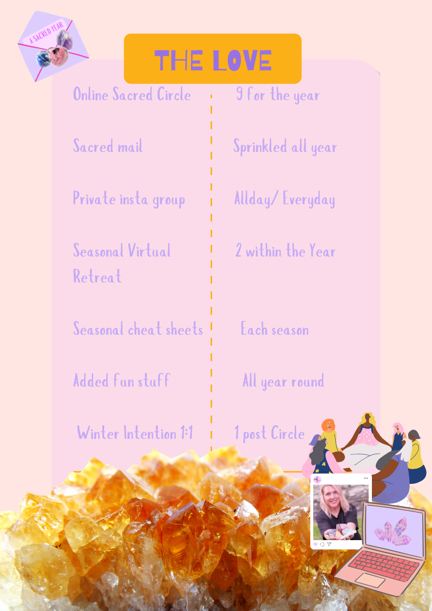 A Sacred Year is a year of connection with yourSelf and with others. It is You empowering yourSelf, choosing You, prioritising yourSelf in a Sacred way. It is harnessing the energy of the seasons, honouring them, and learning and exploring the simple & the subtle ways of honouring yourSelf during the shifts throughout the year. It's the new 'SELF CARE'. It's light hearted and fun, not all just Om's and the deep work. Nothing is a chore here, it's ease-ful to adopt and bring into your daily life.